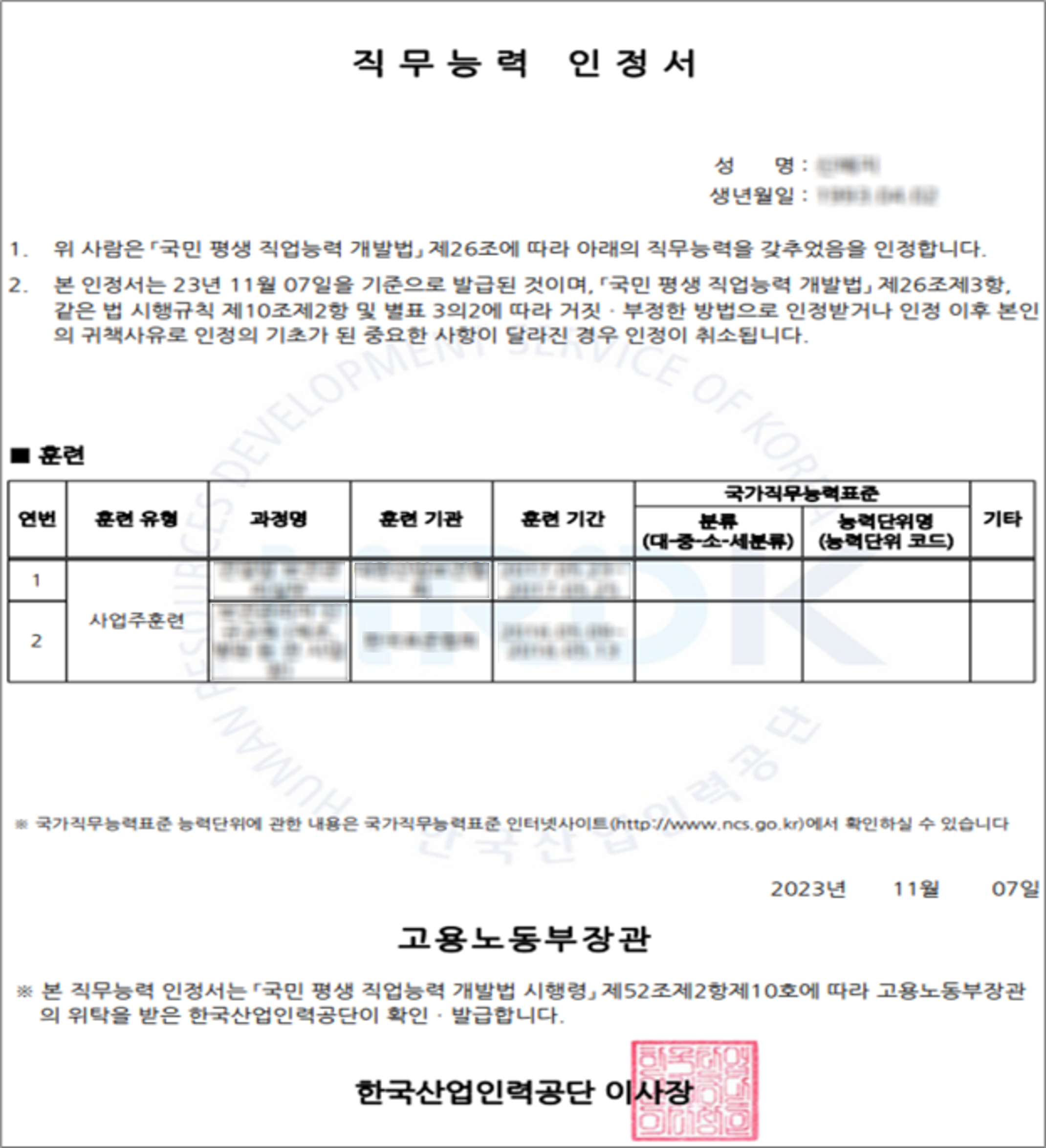 보유하고 있는 직무능력 인정내역 확인